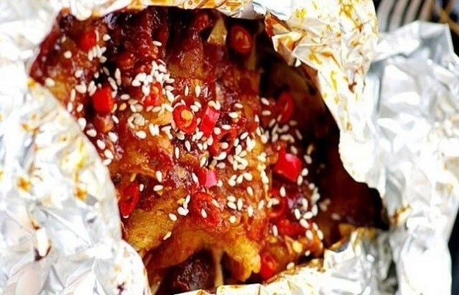 Sau khi đã chuẩn bị xong hết chúng ta gấp giấy bạc lại, nhớ miết các mép của giấy bạc lại để không bị hở thì phần nước sốt sẽ không bị chảy ra ngoài. Khi đã gói xong bạn đem thịt vào trong lò nướng khoảng 30 phút trong nhiệt độ 180 độ C (lưu ý nên bật nóng lò nướng trước).