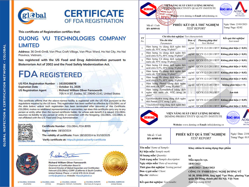 Chứng nhận FDA của Hoa Kỳ và phiếu kiểm nghiệm an toàn thực phẩm.