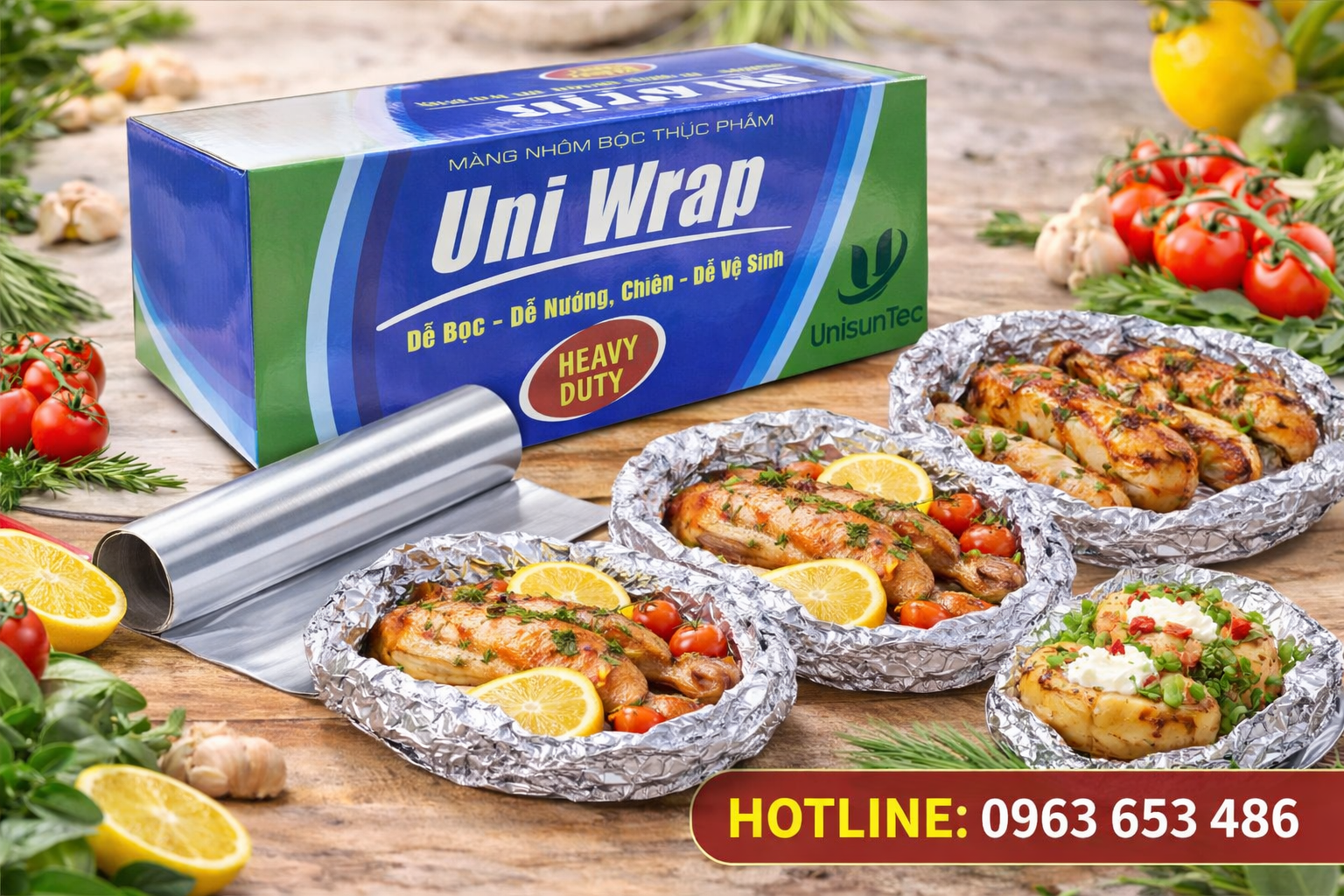 Cuộn giấy bạc Uniwrap 45cm x 250m – màng nhôm bọc thực phẩm chịu nhiệt, an toàn, giá sỉ tận gốc. Phù hợp nhà hàng, bếp công nghiệp, BBQ, xuất khẩu.