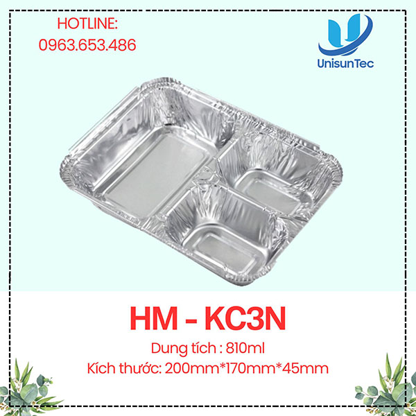 Khay hộp nhôm đựng thực phẩm 3 ngăn HM-KC3 dung tích 820ml nắp giấy tráng nhôm.