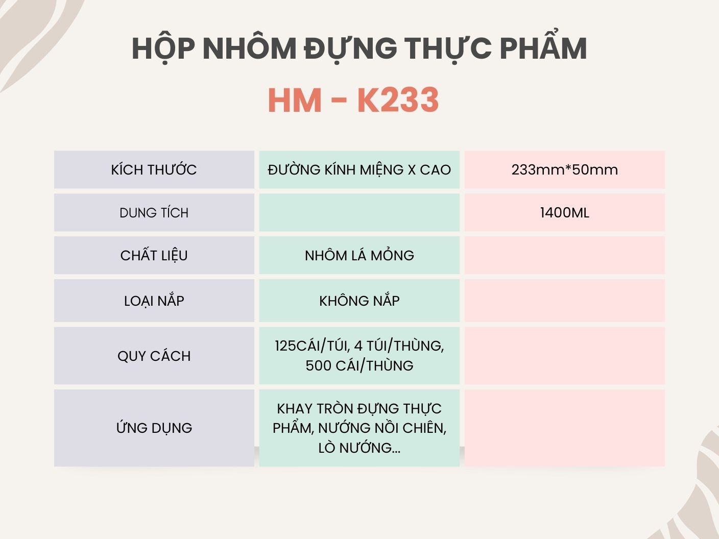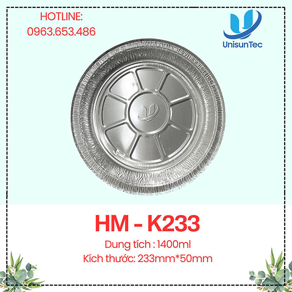 Khay nhôm tròn đựng thực phẩm HM-K233 là sản phẩm tiện dụng với chất liệu nhôm đạt tiêu chuẩn FDA an toàn cho sức khỏe. Khay hộp nhôm đựng thực phẩm rất tiện ích dùng cho nhà hàng, quán ăn, siêu thị, khách sạn, máy bay, tiệm bánh, gia đình